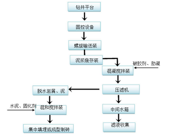 西安華揚油氣設備有限公司此工藝主要流程為:將鉆井過程中排放的廢棄泥漿通過泥漿收集箱,用泵提升送至巖屑緩存裝置,用泵提升至破乳混凝罐,用干粉投加機定量加破乳、助凝藥。混凝液由陶瓷雙缸泵抽至撬裝隔膜壓濾機進行固液分離,分離出來的泥餅由皮帶輸送機輸送出壓濾單元,濾液進入后續凈化處理裝置。