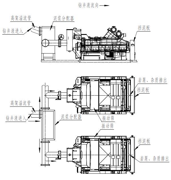 鉆井液通過井口高架溢流管流入振動篩所在一號罐上的鉆井液分配器,進入泥漿振動篩,通過振動篩激振效果使鉆井液中的固相巖屑、雜質處理到鉆井液意外。